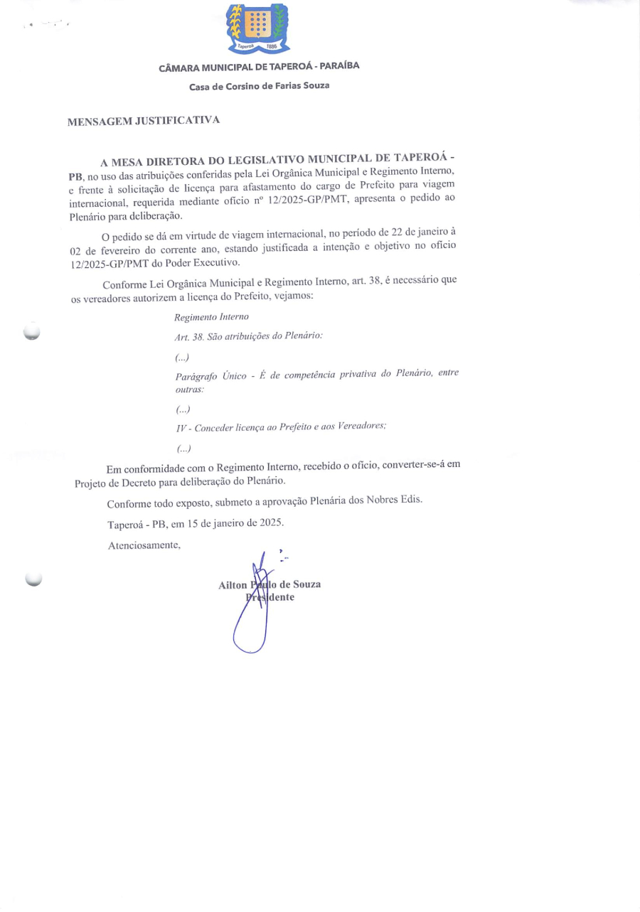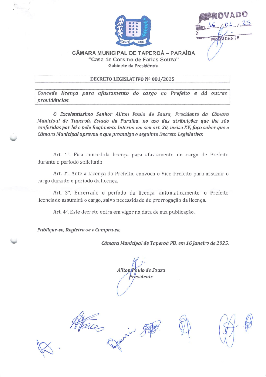 DECRETO LEGISLATIVO N° 0001/2025 – CONCEDE LICENÇA PARA AFASTAMENTO DO CARGO AO PREFEITo