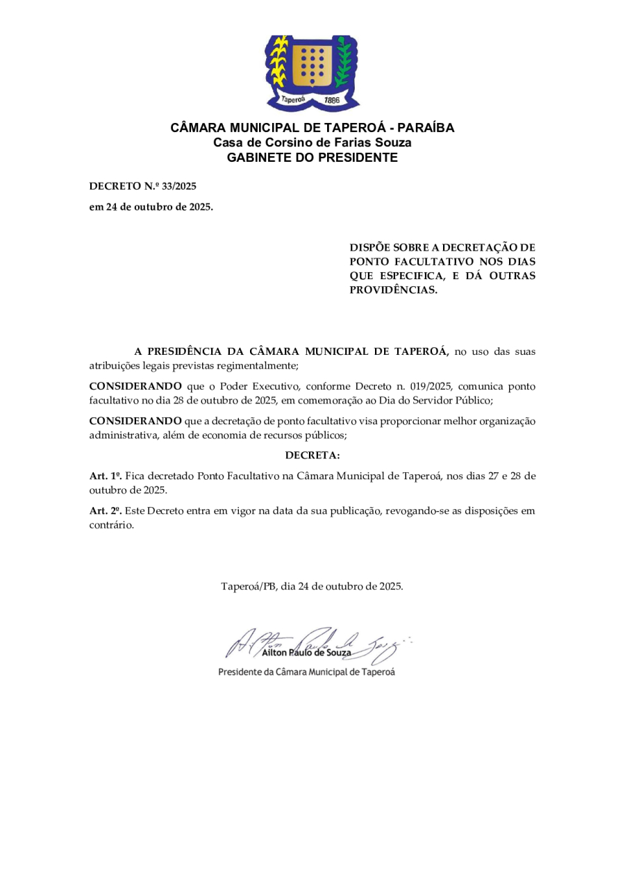 DECRETO N° 0033/2025 – DISPÕE SOBRE A DECRETAÇÃO DE PONTO FACULTATIVO NOS DIAS QUE ESPECIFICA