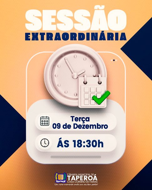Nesta terça (09/12) iremos realizar de forma presencial e transmissão pelo Youtube, a Sessão Extraordinária da Câmara Municipal de Taperoá, Casa Corsino de Farias. Você é nosso convidado para acompanhar todo o debate do Poder Legislativo. 🕡 Ás 18:30h 📍Sede da Câmara Municipal de Taperoá-PB