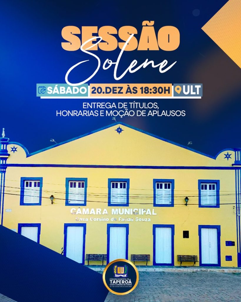 A Câmara Municipal de Taperoá anuncia a realização de uma Sessão Solene de grande relevância para a comunidade local. O evento ocorrerá neste sábado, 20 de dezembro, às 18h30, na ULT, com a finalidade de homenagear e reconhecer publicamente cidadãos que se destacaram por suas valiosas contribuições ao desenvolvimento e bem-estar do município. Durante a […]