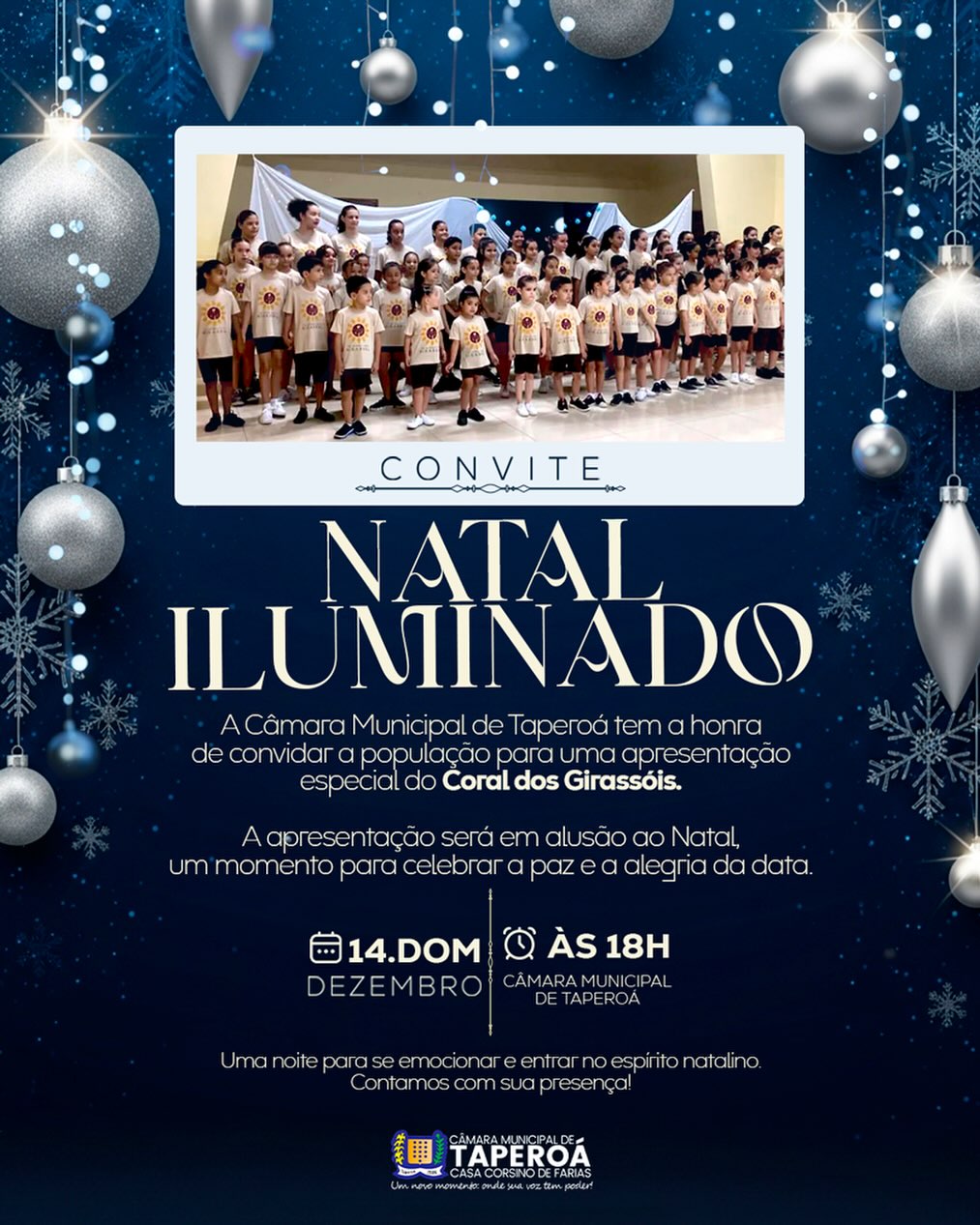 A Câmara Municipal de Taperoá tem a honra de convidar toda a população para participar do evento “Natal Iluminado”, uma celebração especial em comemoração ao espírito natalino. A iniciativa busca proporcionar à comunidade uma noite repleta de magia, emoção e união, transformando as dependências da Câmara em um ambiente festivo e acolhedor.
